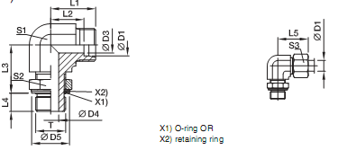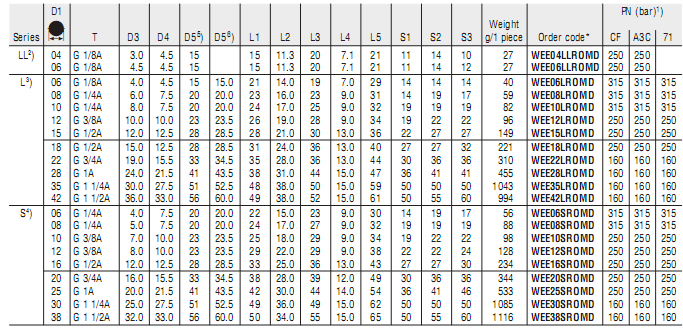EO 24°Cone end/ Adjustable BSPP thread-O-ring + retaining ring(ISO1179)for ports withsmall or wide spot face;differences in D5 stainless steel are only for ports with wide spot face (e.g.WEE16SR BOMD71)